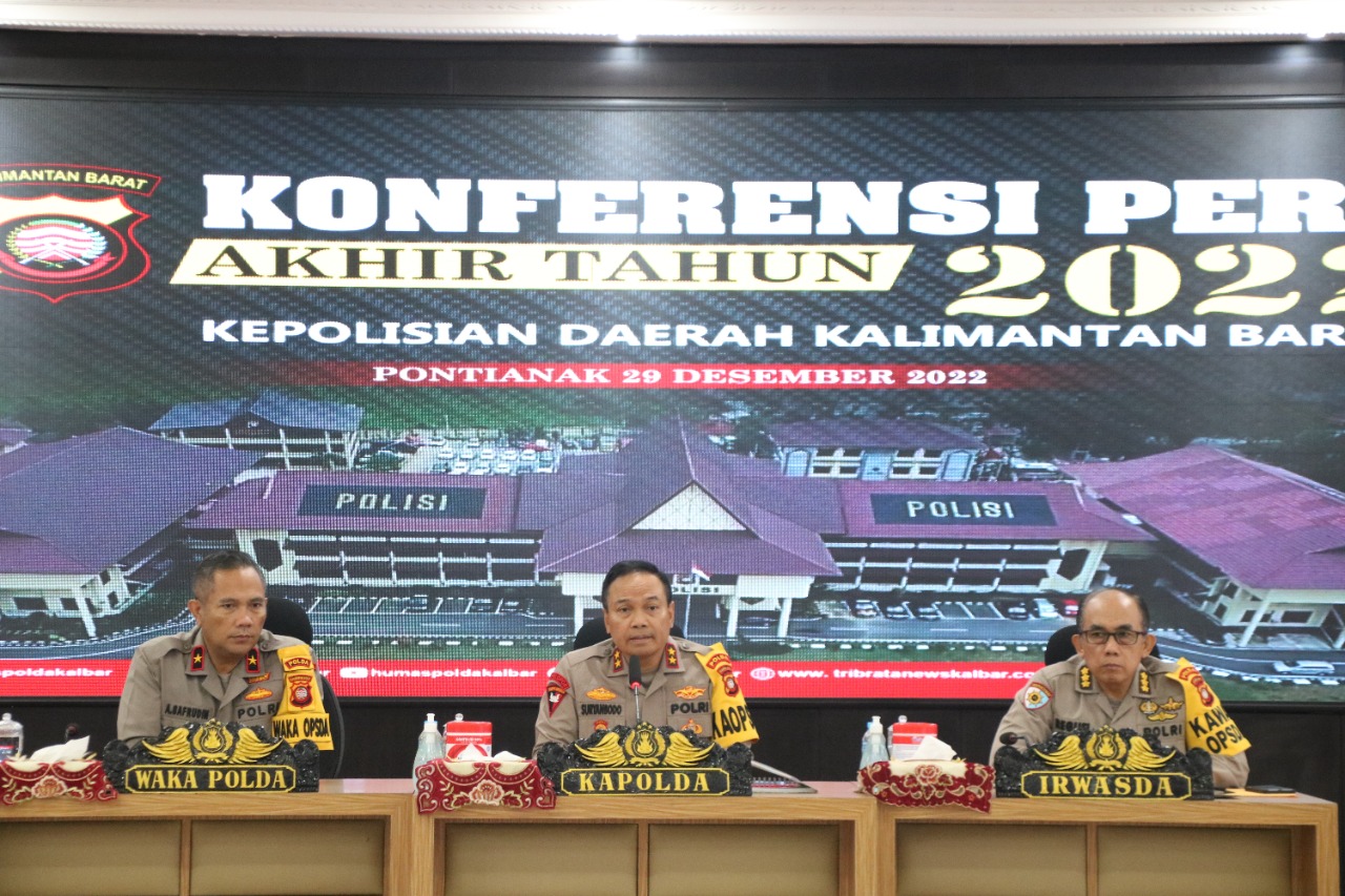 Pontianak Kalbar (KPN) – Kepala Kepolisian Daerah Kalimantan Barat Irjen Pol Drs. Suryanbodo Asmoro memimpin Press Conference akhir tahun 2022, Kamis (29/12) bertempat di Ruang Graha Khatulistiwa Mapolda Kalbar.