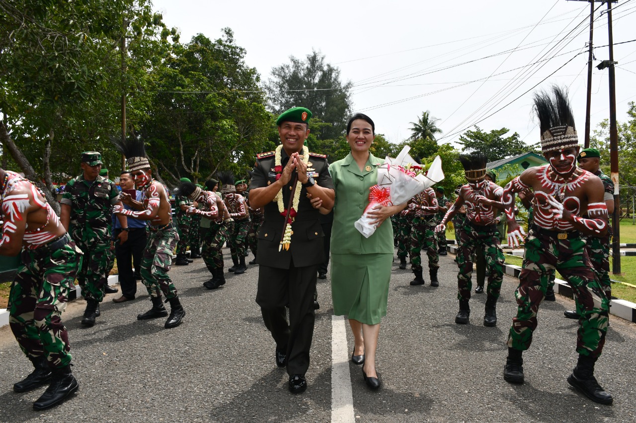 Penyambutan diawali dengan pengalungan bunga, minum air kelapa dan di iringi tarian adat Papua oleh anggota Korem 181/PVT selanjutnya menerima dengan penghormatan dan jajar serta tradisi pedang pora didepan makorem 181/PVT disambut oleh pejabat lama Danrem 181/PVT Brigjen TNI Wawan Erawan, S.E.,M.M.