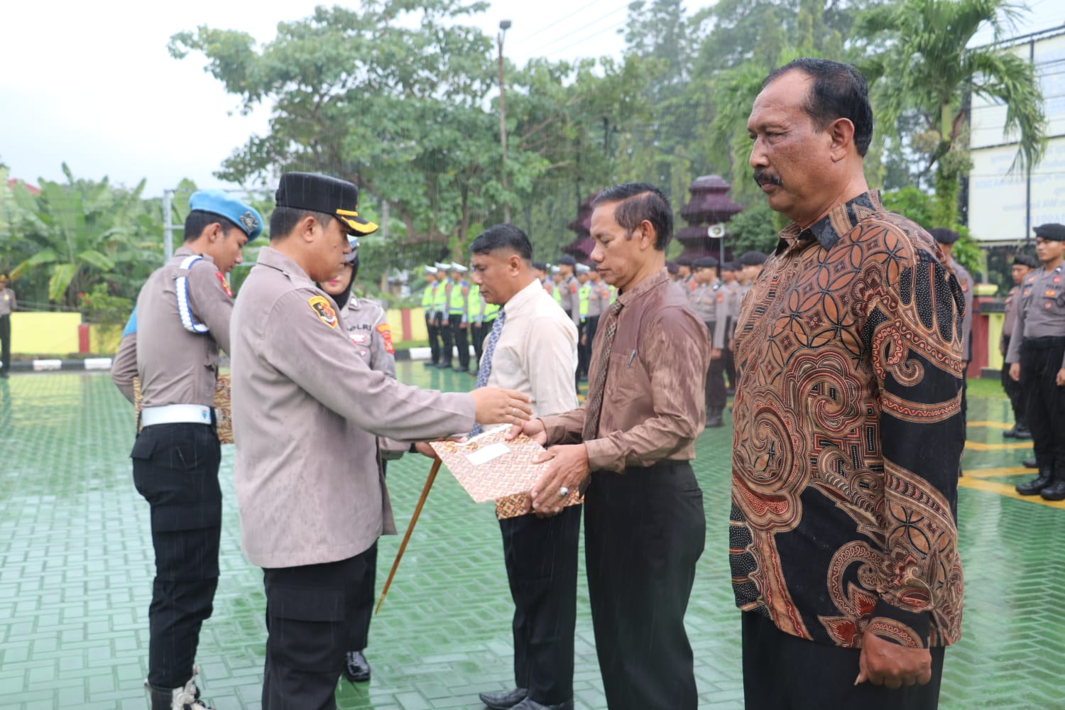 Sukabumi (KPN) – Momen upacara dalam rangka penyerahan Surat Keputusan Pensiun Kompol (Purn) Suwardi, mantan Kabag Ops Polres Sukabumi diiringi dengan turun hujan yang cukup deras.