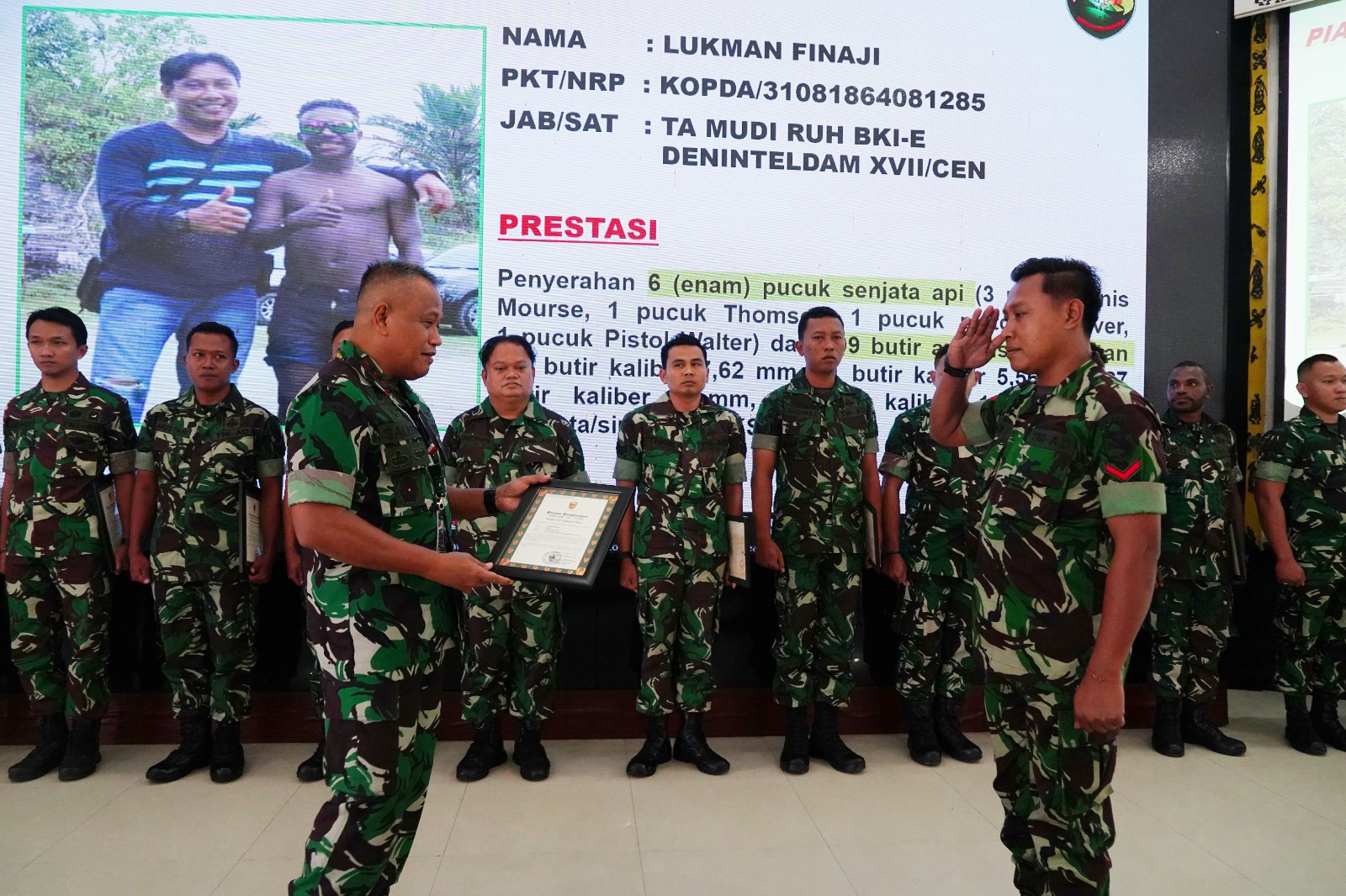 “17 personel dari anggota Deninteldam XVII/Cenderawasih berprestasi berhasil melaksanakan pendekatan kepada masyarakat dengan menyerahkan beberapa pucuk senjata api beserta munisinya,” kata Kapendam.