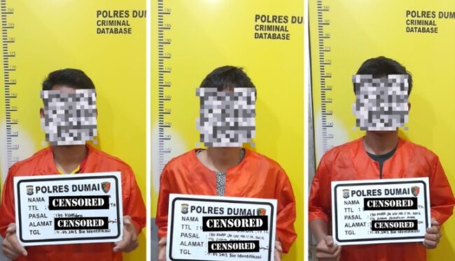 DUMAI (KPN) – Gerak cepat Satuan Reskrim Polres Dumai akhirnya berhasil menangkap tiga orang tersangka pengerusakan sepeda motor milik korban Pria Agung. Mereka masing-masing berinsial N (17), F (16) dan A (19) ketiganya warga Kecamatan Dumai Timur diketahui dari tiga pelaku terdapat masih pelajar.