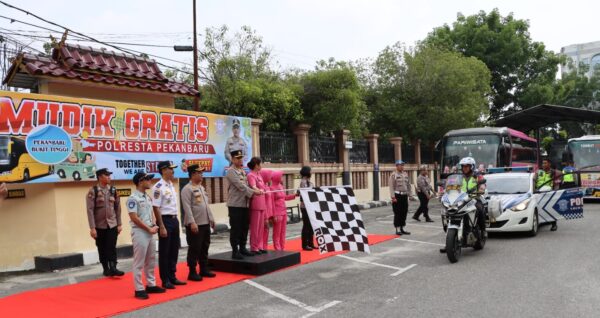 PEKANBARU (KPN) – Kapolresta Pekanbaru, Kombes Pol Jefri R P Siagian bersama dengan stakeholder terkait resmi melepas 2 bus rombongan mudik gratis tujuan Sumatera Barat (Sumbar) dalam program “Mudik Gratis Polresta Pekanbaru.”