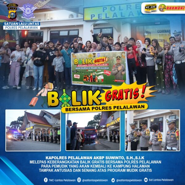 Dua armada bus yang didominasi oleh pelajar, mahasiswa serta karyawan swasta dengan tujuan Sumatera Utara dan Pulau Jawa disiapkan Polres Pelalawan dalam program layanan balik gratis. Kegiatan tersebut diselenggarakan sebagai bentuk kepedulian Polres Pelalawan kepada masyarakat yang baru selesai merayakan Idul Fitri 1444 H di Kabupaten Pelalawan dan akan balik ke daerah asalnya.