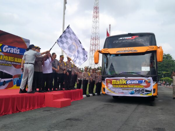 Ratusan penumpang di berangkatkan untuk balik gratis menuju kota asalnya dengan menggunakan 4 bus armada pariwisata yang di fasilitasi Polda Riau dan Polres Jajaran, Sabtu (29/04/2023) sekira pukul 10.00 WIB.