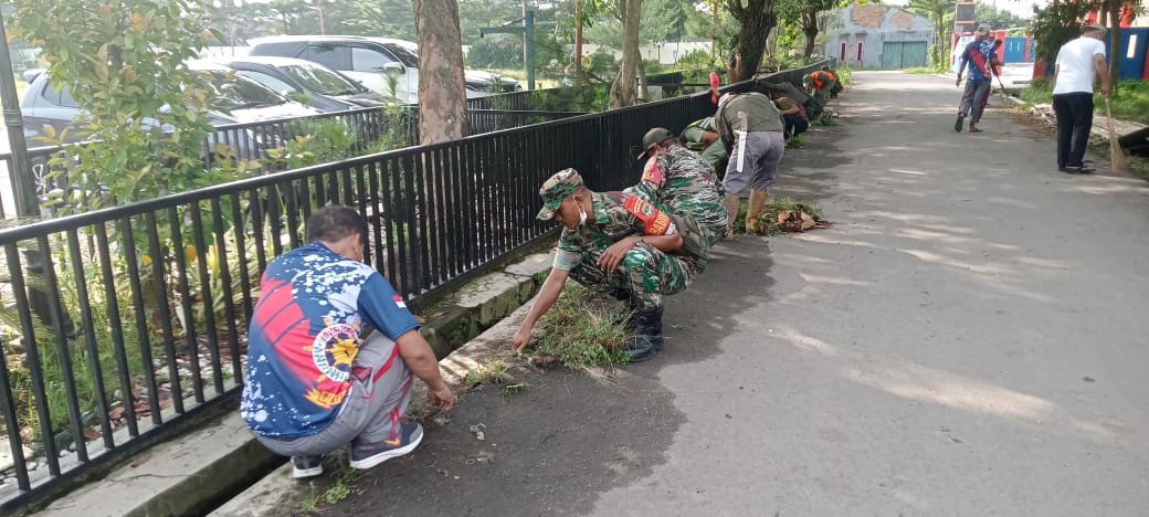 KABAR PUBLIK BEKASI | Dalam rangka mewujudkan lingkungan yang bersih anti kumuh dan kotor Babinsa Koramil 12 Serangbaru Bersihkan Halaman Kantor Kecamatan Serangbaru, Minggu 30/4/2023