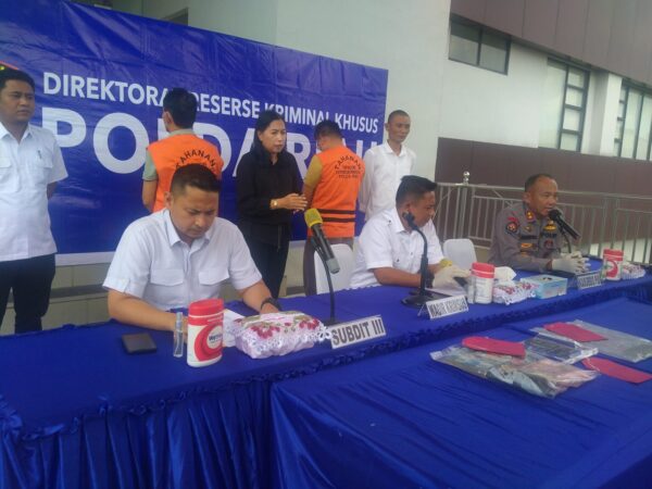 PEKANBARU (KPN) – Polda Riau gelar press conference Operasi Tangkap Tangan (OTT) Kadinkes Kampar dan Kapus Sibiruang di teras belakang Mapolda, Senin (15/05).