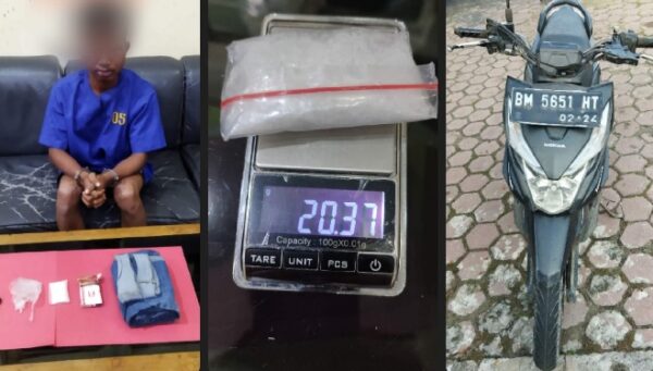 Saat digeledah tersangka mengeluarkan bungkusan dari lipatan celana jeans panjang warna Biru dan setelah dibuka berisi kotak rokok merk Sempurna Mild yang didalamnya berisi 1(satu) paket yang diduga narkotika jenis sabu dengan berat kotor 20,37 (duapuluh koma tiga tujuh) gram. Selain narkotika jenis sabu turut diamankan 1(satu) unit Handphone Android merk Vivo warna Biru yang diduga sebagai alat komunikasi transaksi dan 1(satu) unit sepeda motor Honda Beat Streat warna Hitam BM 5651 HT.