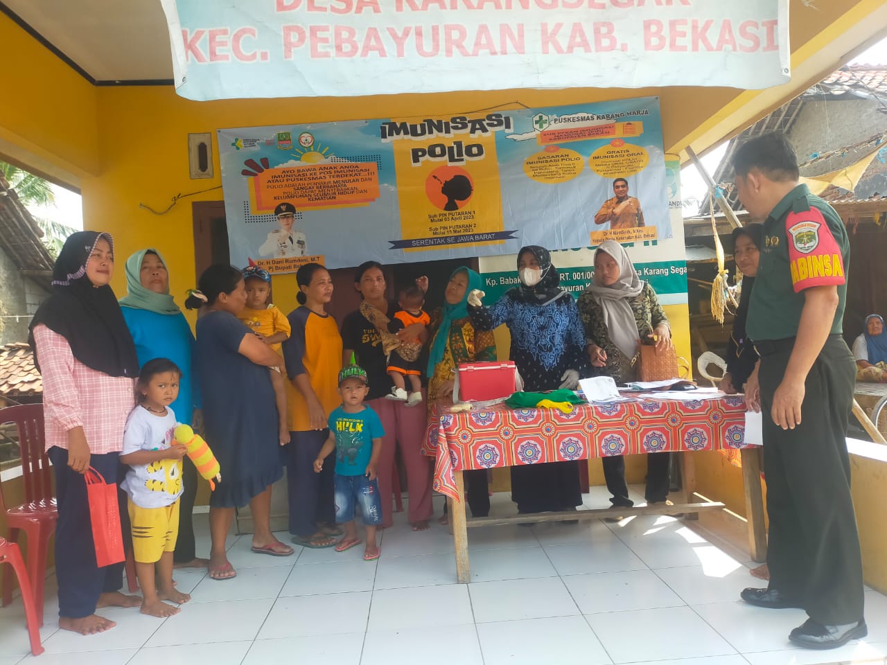 Pada Kegiatan tersebut, Babinsa Koramil 11 Pebayuran Serma Firman di dampingi Bidan Desa Karang segar turut memberikan tetes manis polio kepada sejumlah balita.