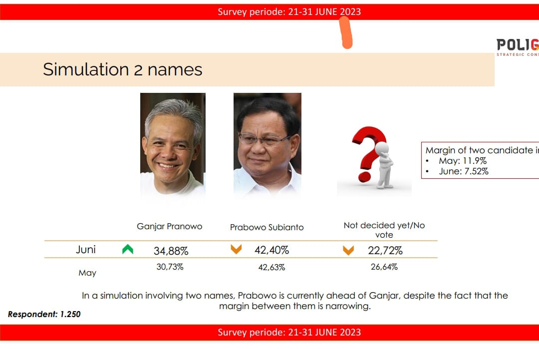 “Yang menjadi catatan penting, meski Prabowo unggul dari Ganjar, tapi jaraknya mengecil. Dari 11,9% di bulan Mei, menjadi 7,5% di akhir Juni.”