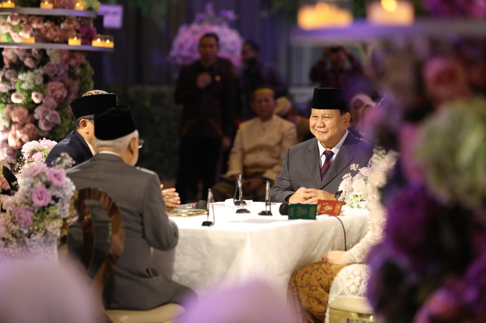 Mengenakan setelan jas dan kopiah hitam, Prabowo menjadi saksi bersama Wakil Presiden RI, Ma’ruf Amin.