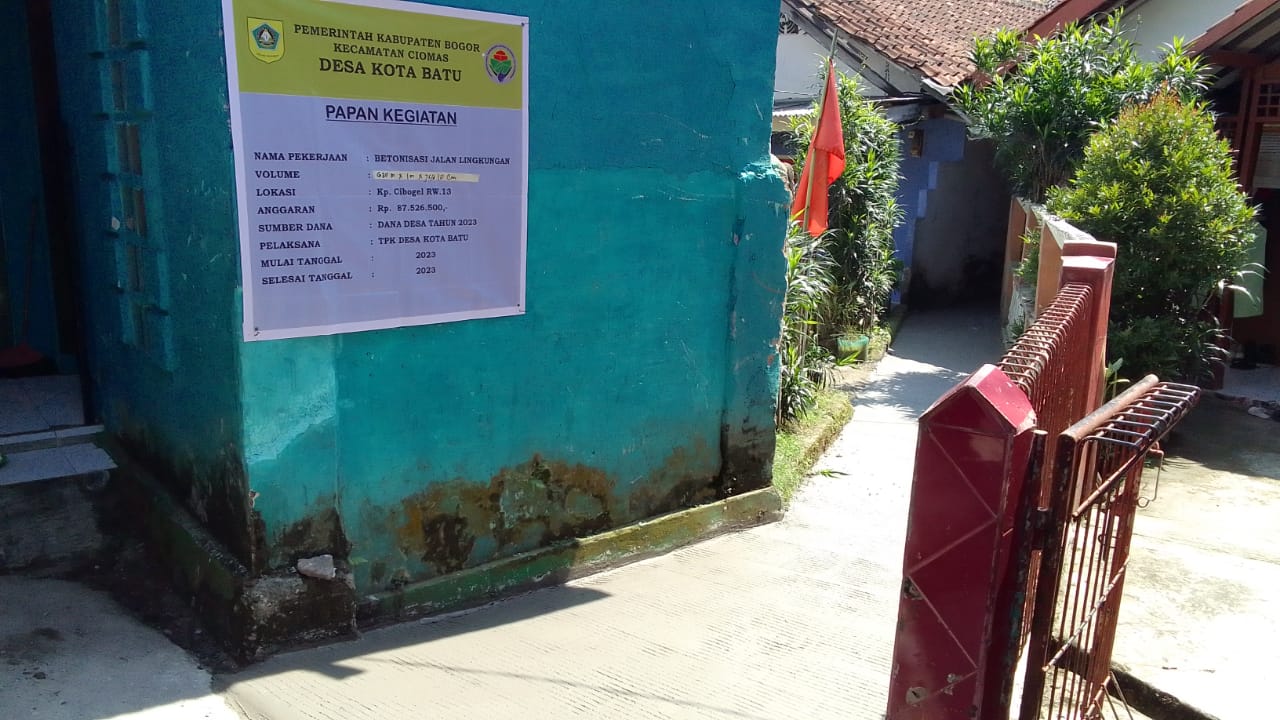 pembangunan infrastuktuk betonisasa jalan lingkungn di wilayah Kp cibogel Rw 13 desa kota batu kecamatan ciomas kabupaten Bogor