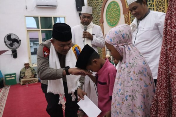 Usai memberikan sambutan, Kapolres Pelalawan menyerahkan santunan kepada 5(lima) orang anak yatim yang berada di sekitar masjid Al-Ikhlasul Amal.