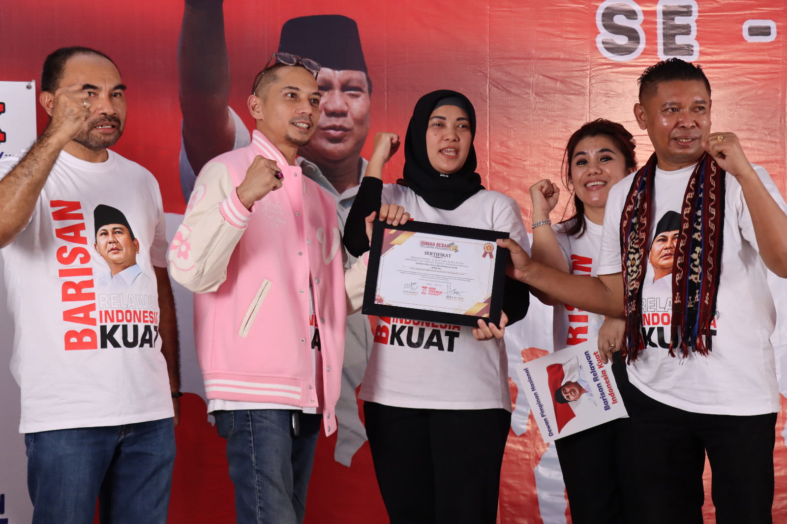 Dengan mengenakan jaket berwarna pink, Fauzi juga menambahkan, tentunya kami tak lupa juga mengucapkan terima kasih tak terhingga kepada rekan-rekan dari BRIK atas dukungan politiknya kepada Bapak H. Prabowo Subianto.