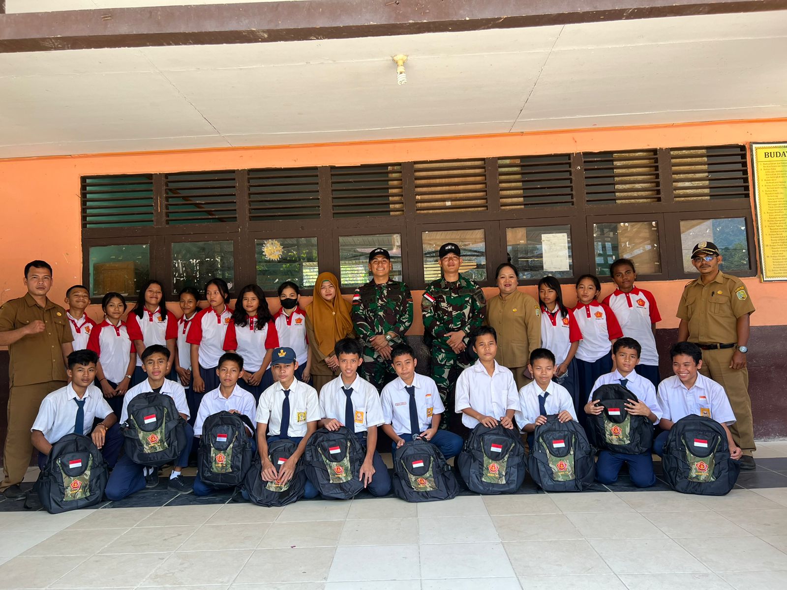 Disampaikan bahwa prajurit Pos Gabma Aruk yang dipimpin Letda Arm Abraham Henry Putra Hutabarat membagikan sarana penggalangan berupa kaos pembagian Mabes TNI beserta tas sekolah berlogokan Mabes TNI kepada para murid di SMPN 01 Sajingan.
