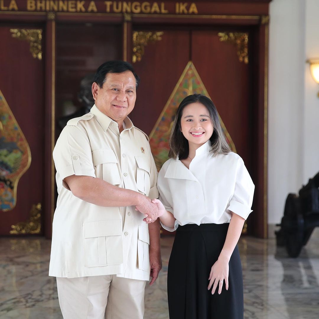 Melalui akun instagramnya @deryanshaa, ia membagikan momen kebersamaan dengan Prabowo. Dery yang hadir mengenakan batik biru mengunggah foto yang menggambarkan pertemuannya dengan Prabowo.