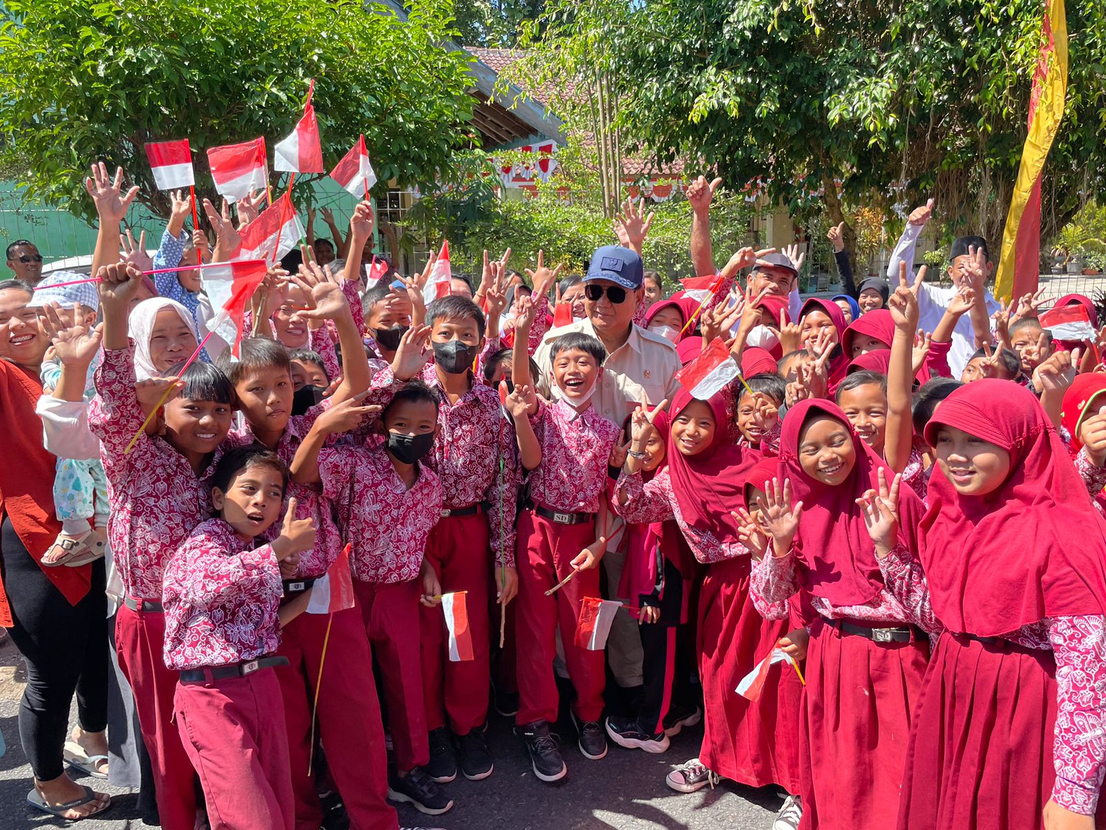 “Siap!’ ucap anak-anak SD seraya mengacungkan jempolnya pada Prabowo