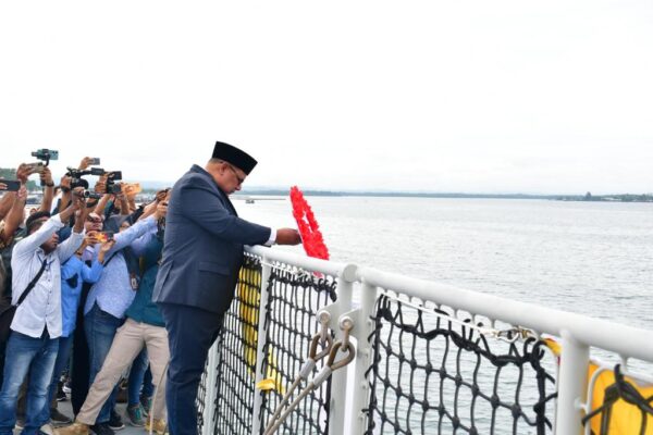 SORONG (KPN) || Sambut HUT Ke-78 Republik Indonesia, Komandan Pasmar 3 Brigjen TNI (Mar) Sugianto, S.Sos., bersama Ketua Korcab Pasmar 3 Ny. Rita Sugianto mengikuti kegiatan tabur bunga di atas geladak heli KRI Wahidin Sudirohusodo-991 yang sandar di dermaga Lantamal XIV Sorong, Jl. Bubara, No. 1, Kelurahan klaligi Distrik Sorong manoi, Kota Sorong, Provinsi Papua Barat Daya. Rabu (16/08/2023).