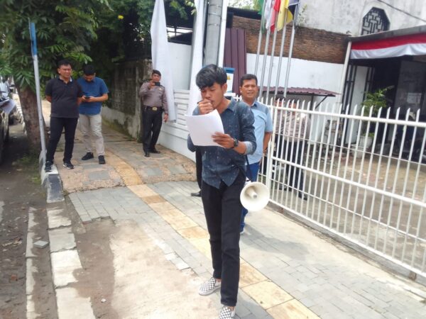 MEDAN (KPN) || Massa Aliansi Mahasiswa Bersatu (AMN) Kota Medan, melakukan aksi damai di Kantor KPU Medan Jalan Kejaksaan, Petisah Tengah, meminta KPU membatalkan berkas bakal calon anggota legislatif (Bacaleg) oknum MAR alias Bayek, Rabu (23/08/2023).