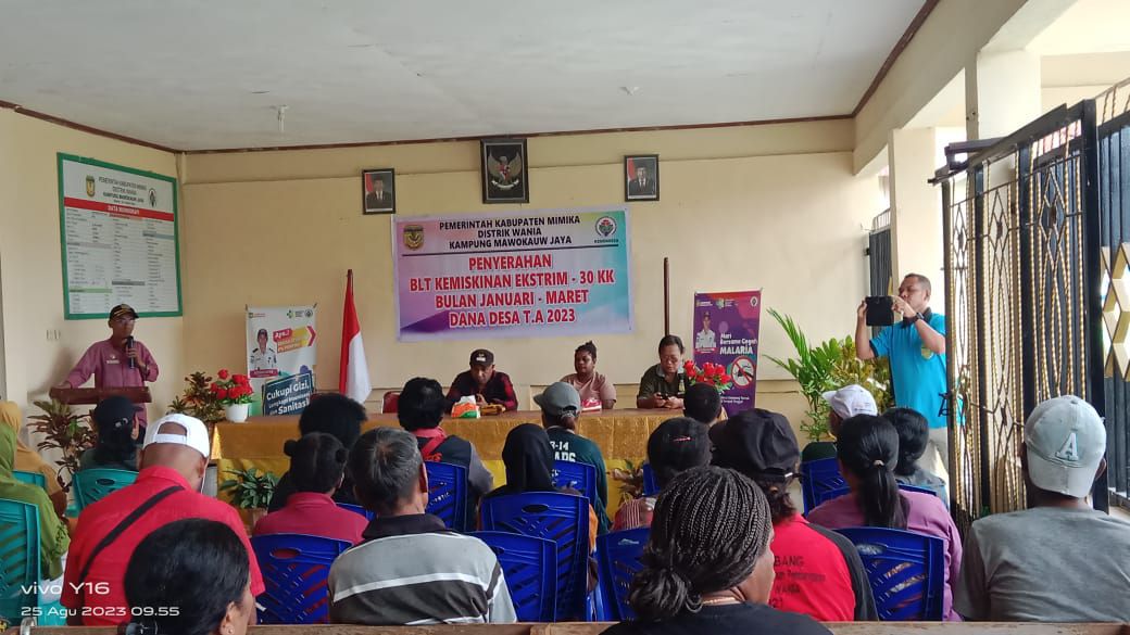 Adanya Bantuan Langsung Tunai dari Pemerintah, Babinsa Koramil 1710-02/Timika, Sertu Rusdin Wali melaksanakan pendampingan dan monitoring penyaluran Bantuan Langsung Tunai Kemiskinan Ekstrim kepada 30 KK warga Kp. Mawokau Jaya, Selasa (29/08/2023). Kegiatan tersebut dilaksanakan di Balai Desa Mawokau Jaya, Distrik Wania, Kabupaten Mimika, dan diikuti bersama warga penerima BLT.