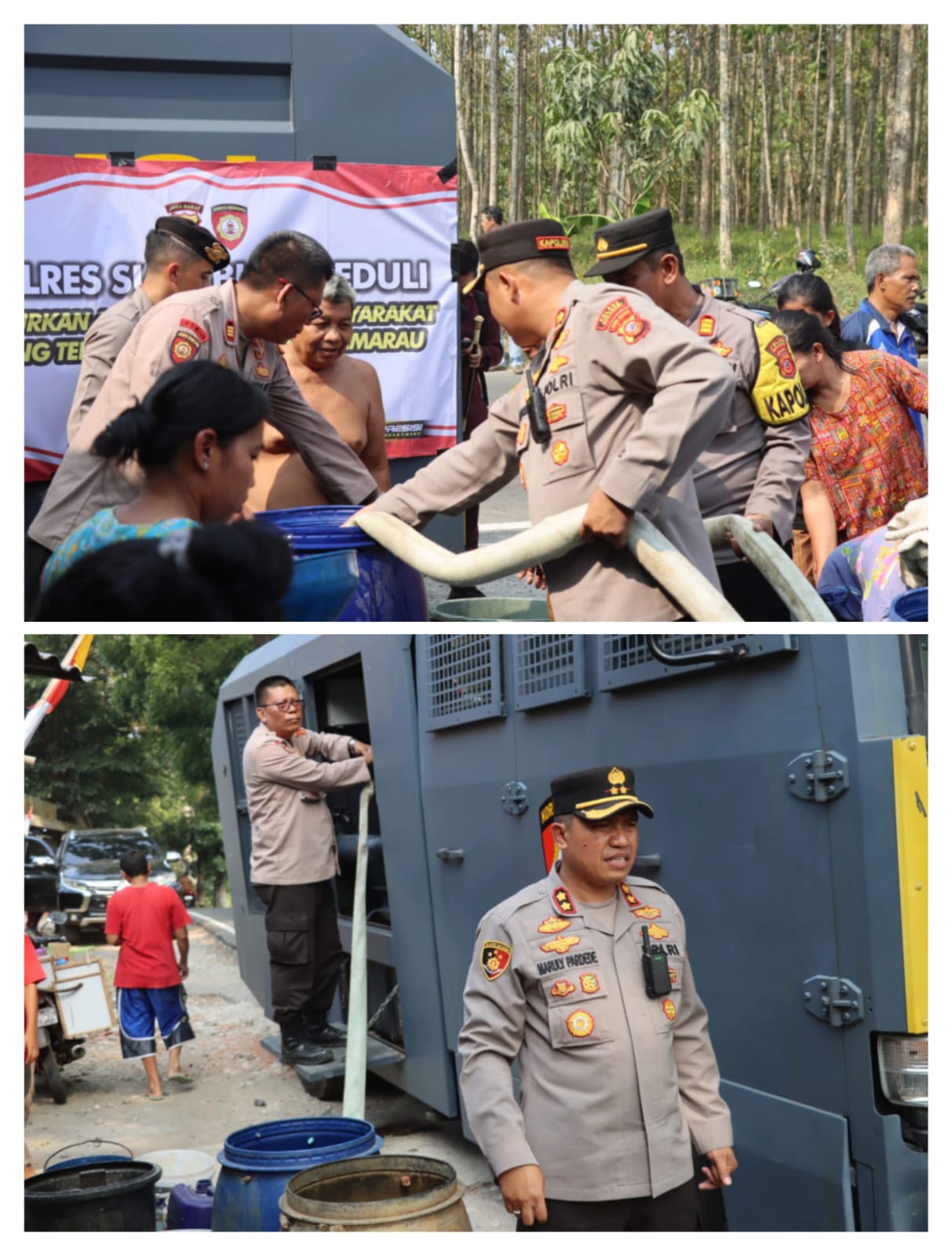 Sukabumi (KPN) – Dalam upaya membantu masyarakat yang terdampak musim kemarau panjang, Polres Sukabumi di bawah kepemimpinan AKBP Maruly Pardede.SH.SIK.MH.telah meluncurkan program “Polres Sukabumi Peduli” diantaranya dengan menyalurkan air bersih kepada warga Desa Bantargadung, Kabupaten Sukabumi, yang terkena dampak krisis pasokan air bersih, Selasa, (29/08/2023).