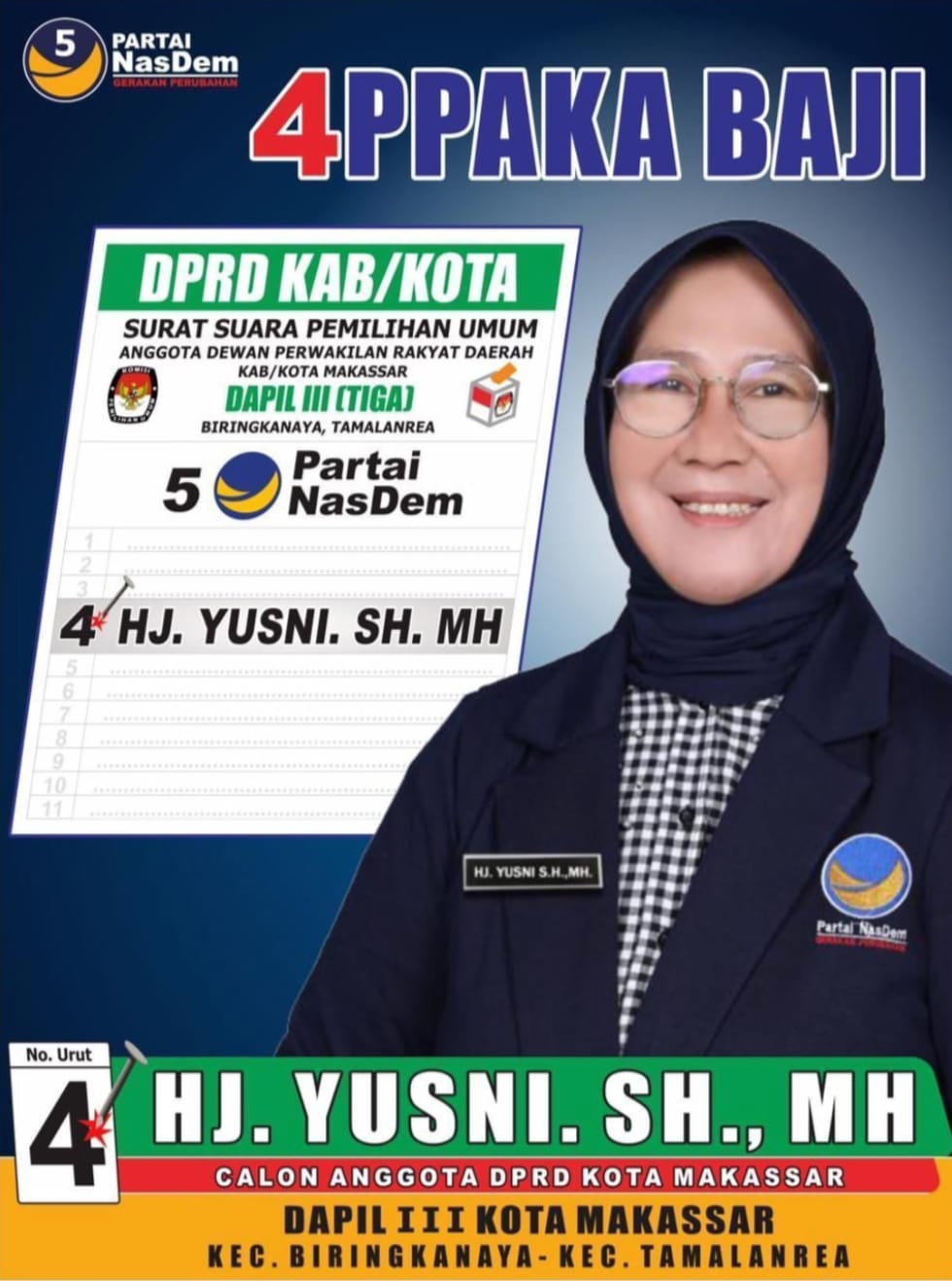 Hj. Yusnia, S.H., M.H., Akan maju dengan mengenderai Partai Nasional Demokrat (Nasdem) Nomor urut (4) dengan wilayah pemilihan Dapil III, Kec, Tamalanrea dan Kec. Biringkanaya dengan Nomor urut 4 dengan Motto 4PPAKA BAJI.