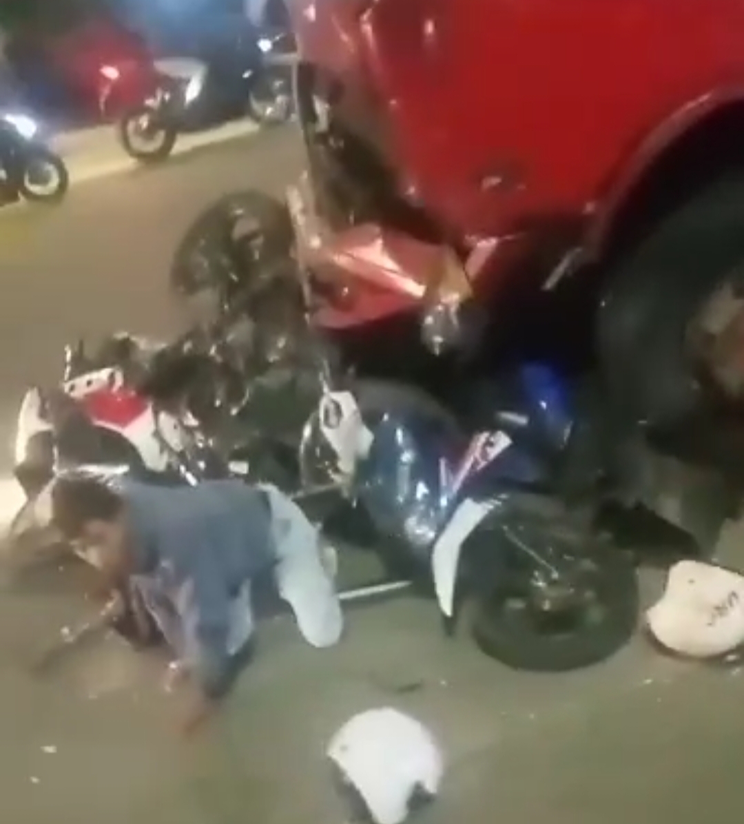 Akibat kecelakaan tersebut, puluhan sepeda motor dan mobil pribadi mengalami kerusakan yang parah.