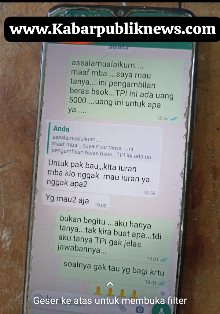 Dalam pesan WhatsApp tersebut, KPM bertanya “Mba (SR) mau tanya besok (19/9/2023) pengambilan beras CPP ada uang 5000 untuk apa ya”? Jawab Ketua PKH “Untuk pak Bau…kita iuran mba, kalau tidak mau iuran tidak apa apa, yang mau aja, ungkapnya di WhatsApp.