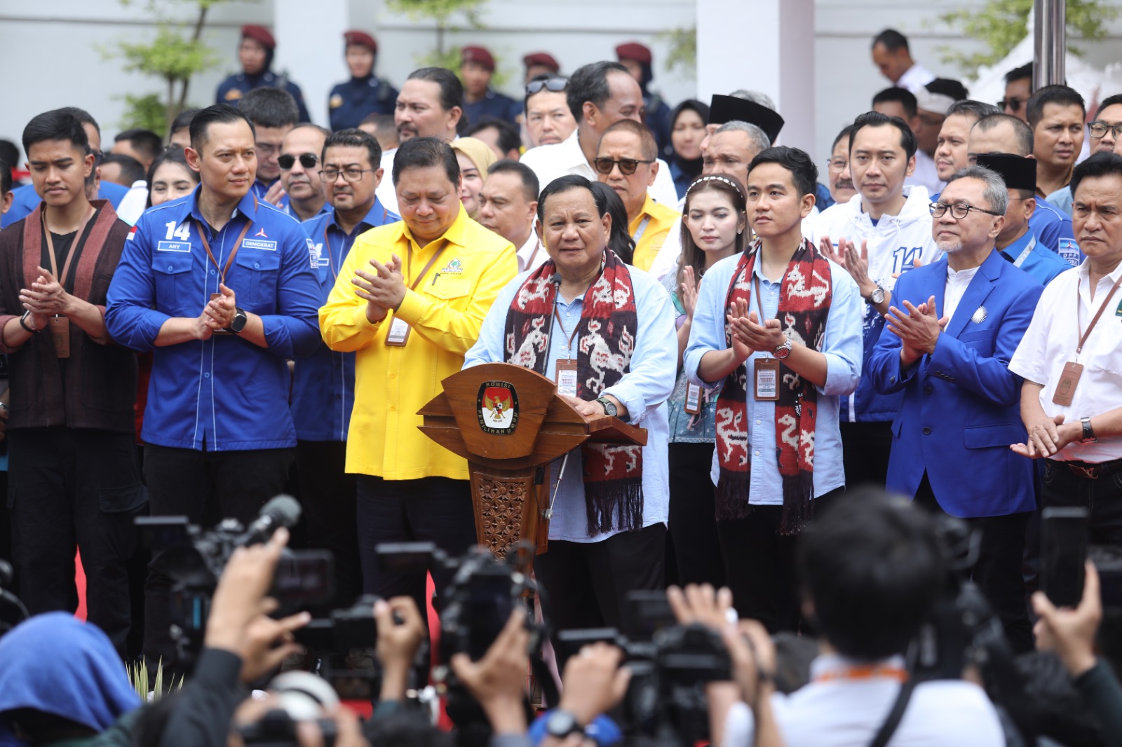 Sebelum berangkat ke KPU Prabowo dan Gibran sempat tampil bersama dan di depan para ketum partai koalisi dan puluhan ribu kader partai dan relawan di Indonesia Arena, GBK, Senayan, Jakarta, Rabu (25/10).