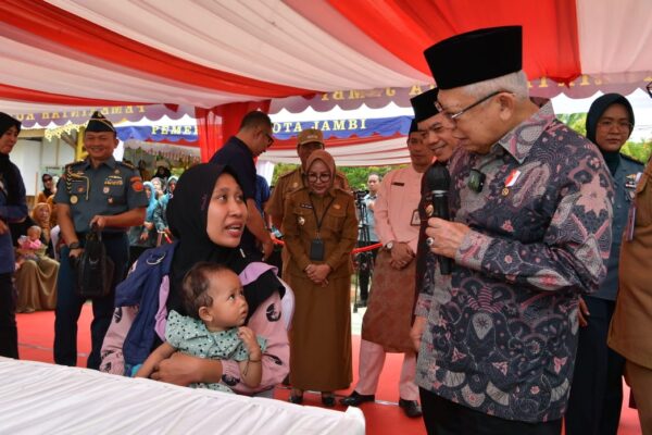 JAMBI (KPN) – Wakil Presiden KH Ma’ruf Amin beserta Ibu Hj Wury Ma’ruf Amin meninjau Posyandu Dahlia I, Kelurahan Thehok, Kecamatan Jambi Selatan, Selasa (31/10/2024).