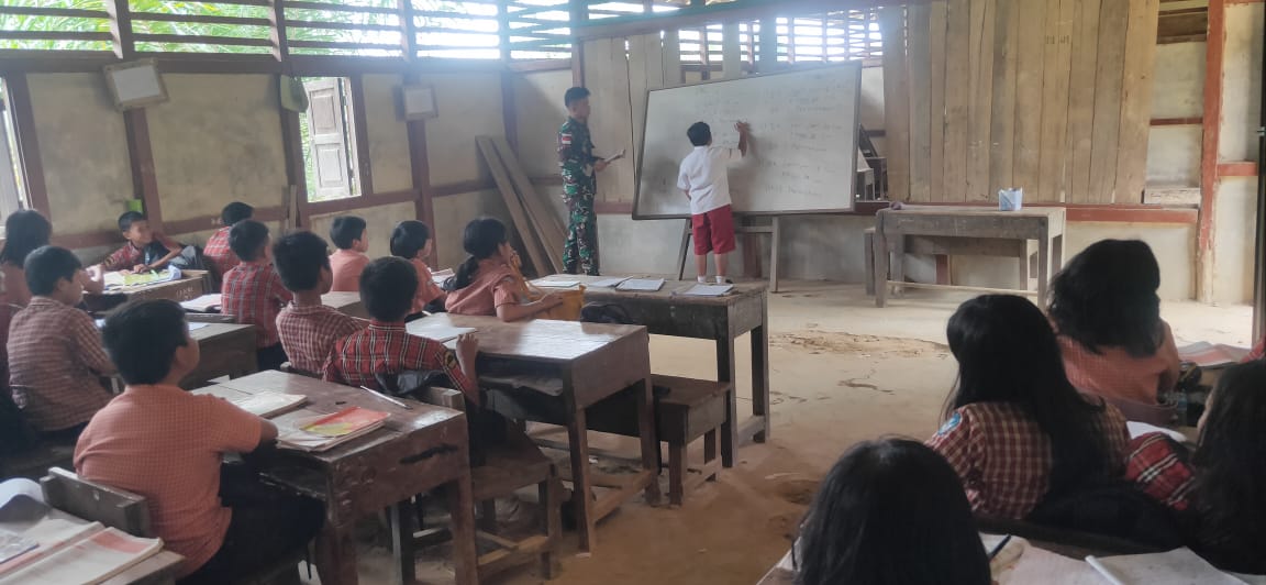 Kabar Publik Sintang | Personil Satgas Pamtas RI-Malaysia Yonarmed 10/ Bradjamusti Pos Muakan, yang dipimpin oleh Danpos Muakan Sertu Rivando, melaksanakan kegiatan belajar mengajar bersama Siswa SDN 08 Muakan di Desa Muakan, Kabupaten Sintang, Kalimantan Barat.(Sabtu,04/11/2023)