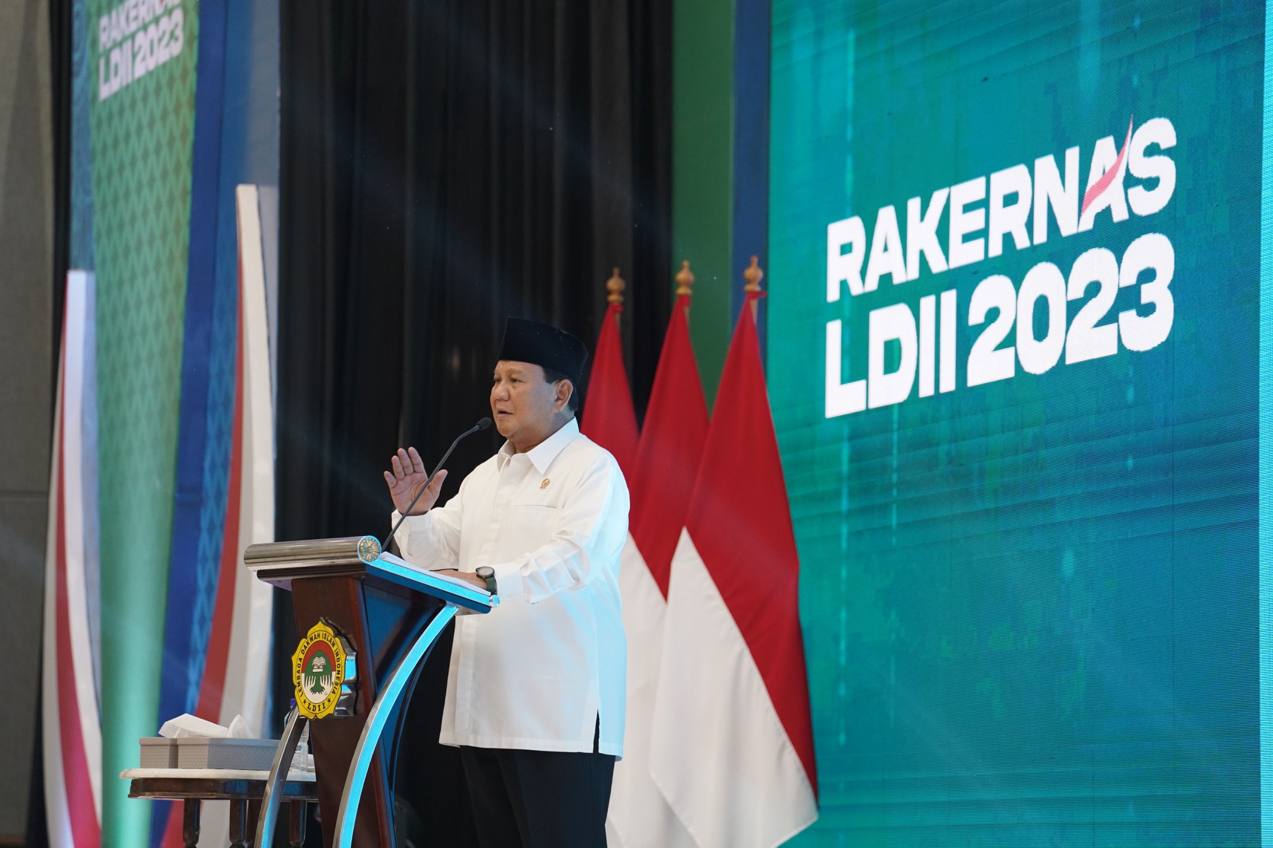 Jakarta || Menteri Pertahanan Prabowo Subianto mengakui keberanian Presiden Joko Widodo dalam menjalankan kebijakan hilirisasi di hadapan ribuan para hadirin acara Pembekalan Materi acara Rakernas LDII 2023 di Grand Ballroom Minhaajurosyidiin, Lubang Buaya, Jakarta Timur, Selasa (7/11).