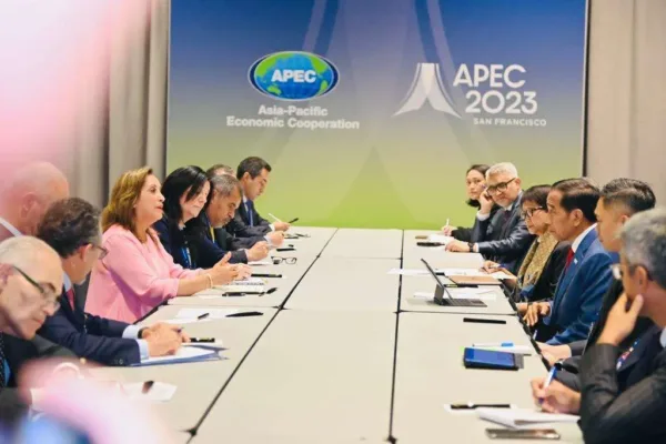 SAN FRANSISCO – Presiden Joko Widodo menggelar pertemuan bilateral dengan Presiden Peru Dina Boluarte di Moscone Center, San Fransisco, Amerika Serikat, pada Kamis, 16 November 2023. Presiden Jokowi menyampaikan komitmen Indonesia untuk mendukung keketuaan Peru dalam APEC 2024.