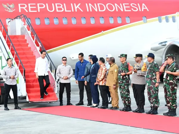 Usai menempuh penerbangan selama 4 jam dari Jakarta, Presiden Jokowi tiba di Bandar Udara Internasional Frans Kaisiepo, Kabupaten Biak Numfor, sekira pukul 16.10 WIT.