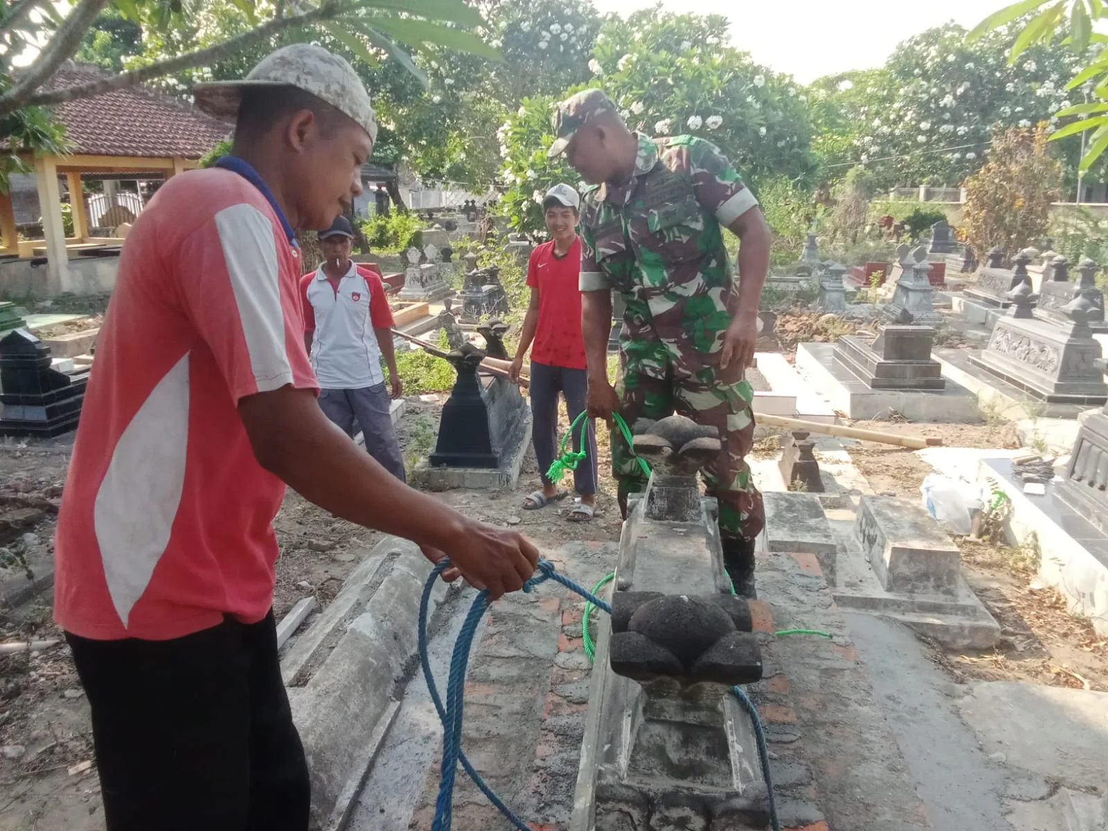Boyolali – Anggota Koramil 09/Sawit Kodim 0724/Boyolali Pelda Sukisno melaksanakan gotong royong membantu masyarakat memperbaiki batu nisan salah satu makam warga diwilayah binaannya di Dukuh Klabang Desa Jatirejo Kecamatan Sawit Kabupaten Boyolali. Minggu (26/11/23)