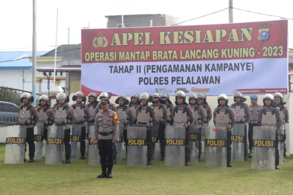PELALAWAN – Polres Pelalawan gelar apel kesiapan Operasi Mantap Brata Lancang Kuning 2023 – 2024 tahap II di halaman apel Mapolres, Selasa (28/11/2023).