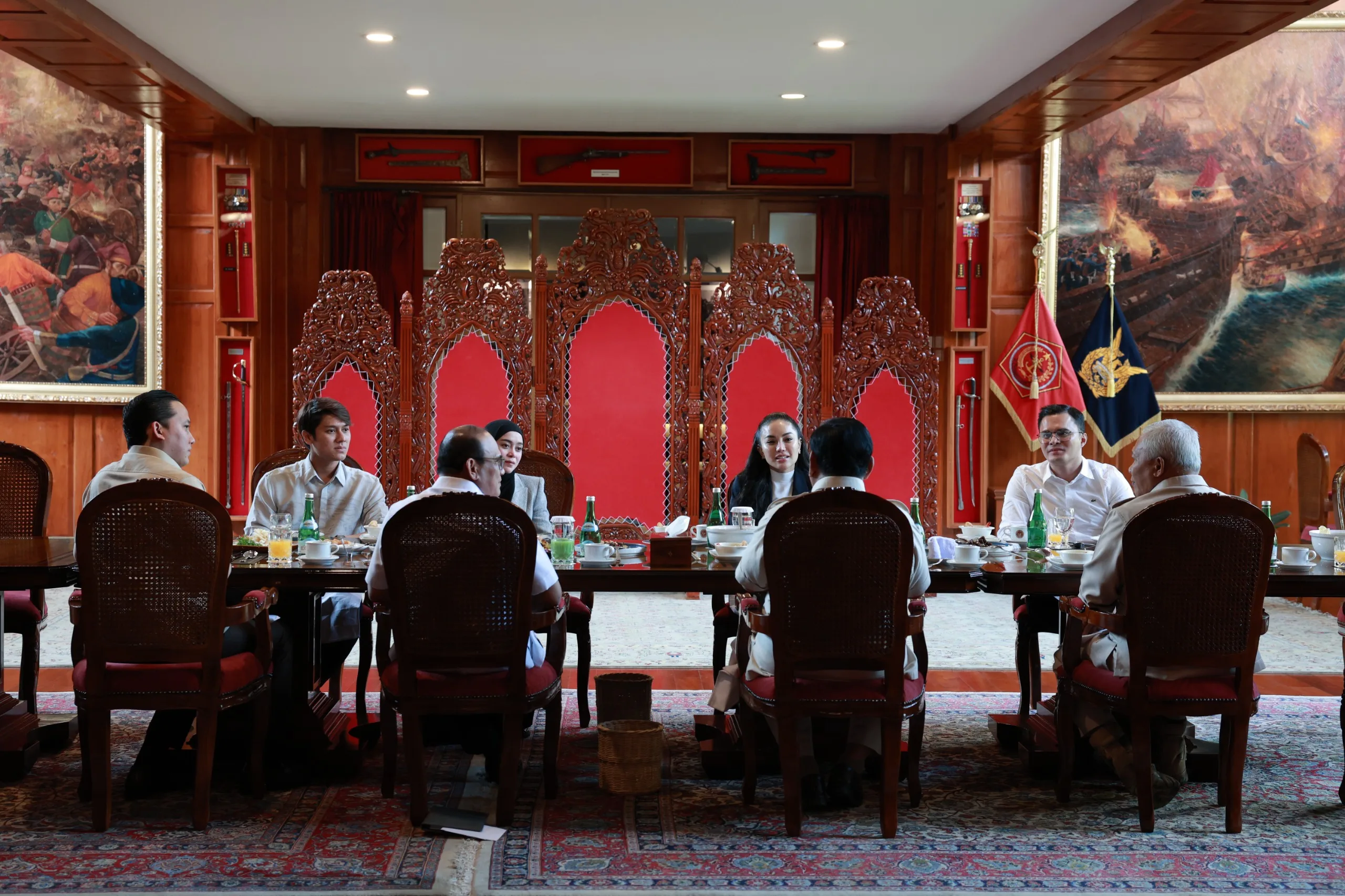 Jakarta – Menteri Pertahanan Prabowo Subianto menerima kunjungan empat artis Indonesia di ruang kerjanya di Kementerian Pertahanan, Rabu (6/12).