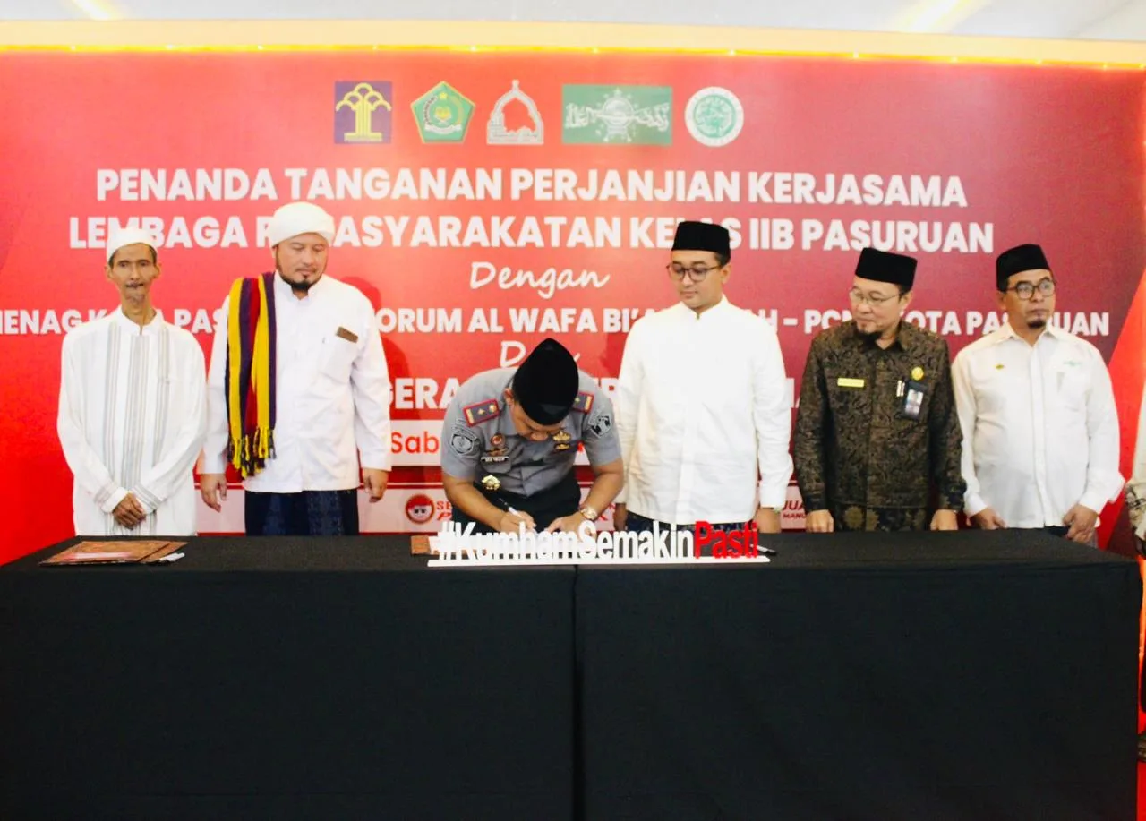 Pasuruan Kota – Kegiatan Penandatangan Perjanjian Kerjasama Antara Lapas Kelas IIB Pasuruan dengan Kemenag Kota Pasuruan, Forum Al-Wafa Bi’ahdillah, PCNU Kota Pasuruan dan Penganugerahan Sertifikat Halal. Kegiatan berlangsung di Aula Saharjo Lapas Kelas IIB Pasuruan Kanwil Kemenkumham Jatim. Sabtu, (27/01).
