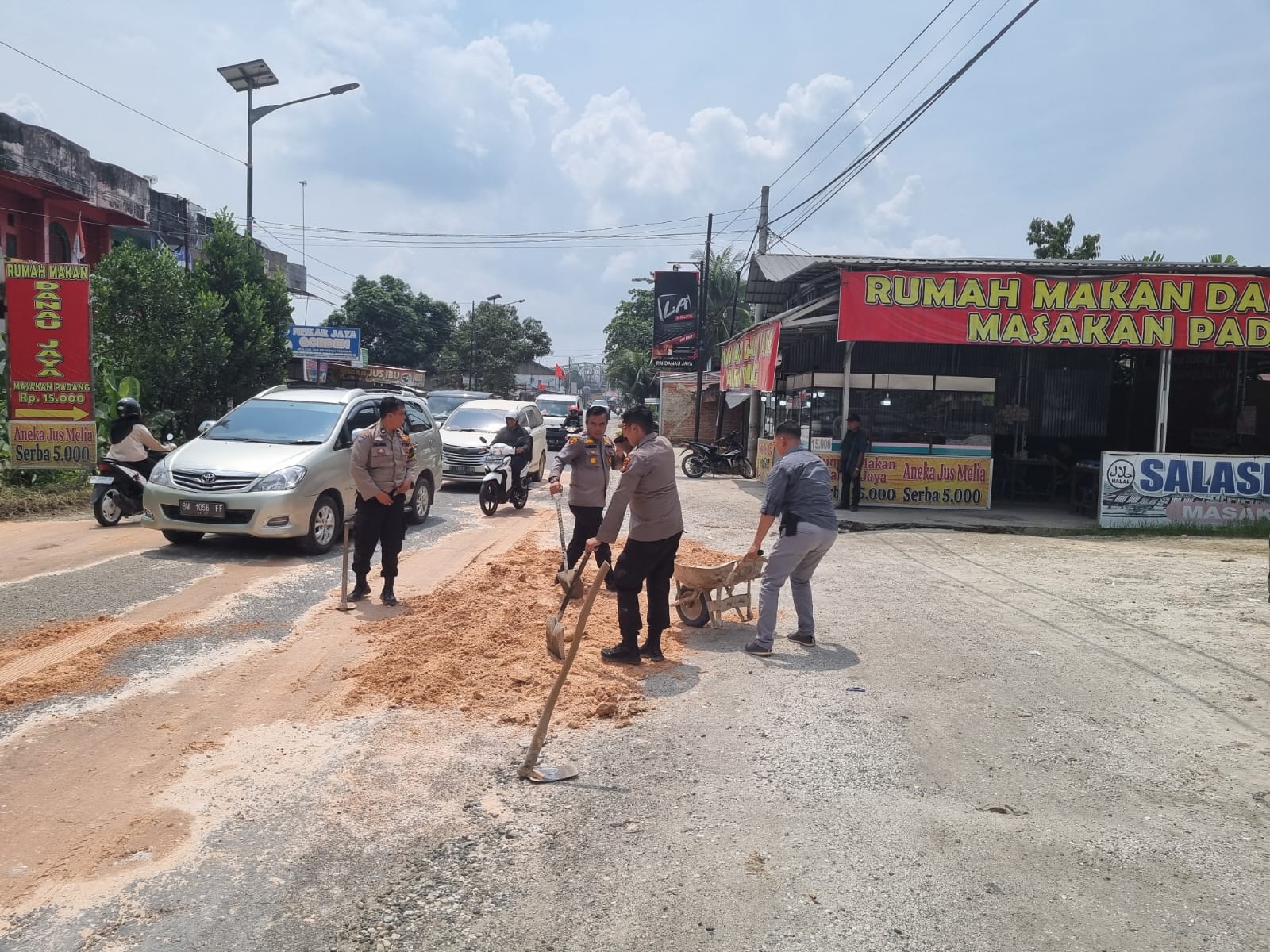 Dengan dibantu masyarakat sekitar, penimbunan dan meratakan jalan lobang tersebut bisa selesai dengan cepat.