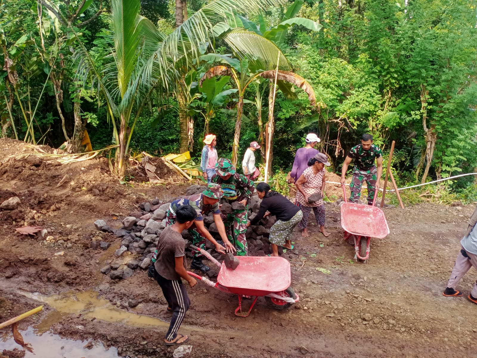 Pasiterdim 1623/Karangasen Kapten Inf Marjuli mengatakan peran warga masyarakat tidak bisa dipandang sebelah mata, mereka setiap harinya bercucuran keringat membantu TNI anggota Kodim 1623/Karangasem dalam mengangkut material seperti batu, semen dan pasir dengan cara memikul dan menggunakan gerobak dorong untuk membuat senderan badan jalan.