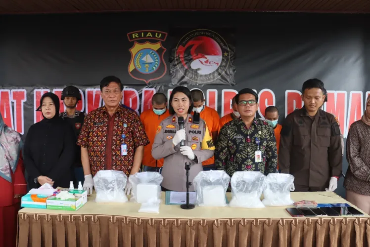 DUMAI – Menindaklanjuti atensi Kepala Kepolisian Negara Republik Indonesia Jenderal Polisi Drs. Listyo Sigit Prabowo, M.Si menindak tegas dan mengusut tuntas hingga ke akarnya kasus peredaran narkotika di tanah air, Sat Res Narkoba Polres Dumai berhasil menggulung 4 tersangka dengan barang bukti sebanyak ±5.000 gram Narkotika Bukan Tanaman Jenis Shabu dan 150 butir Narkotika Bukan Tanaman Jenis Pil Ekstasi.