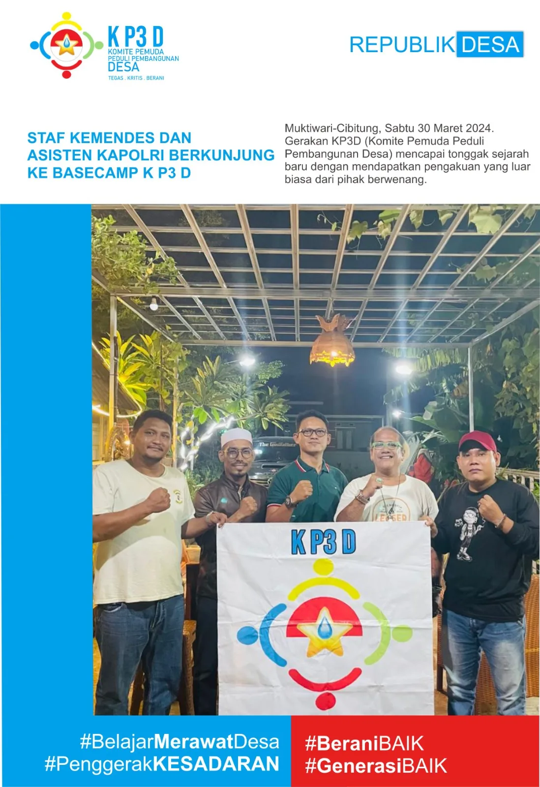 KABAR BEKASI – (Muktiwari Cibitung) – Gerakan KP3D (Komite Pemuda Peduli Pembangunan Desa) mencapai tonggak sejarah baru dengan mendapatkan pengakuan yang luar biasa dari pihak berwenang. Sebagai bukti dari dampak yang telah dihasilkan oleh gerakan ini, Staf Kementerian Desa, Pembangunan Daerah Tertinggal, dan Transmigrasi (Kemendes PDTT) serta Asisten Kepala Kepolisian Republik Indonesia (Asisten Kapolri) telah berkunjung ke basecamp Gerakan KP3D.Sabtu (30 Maret 2024).
