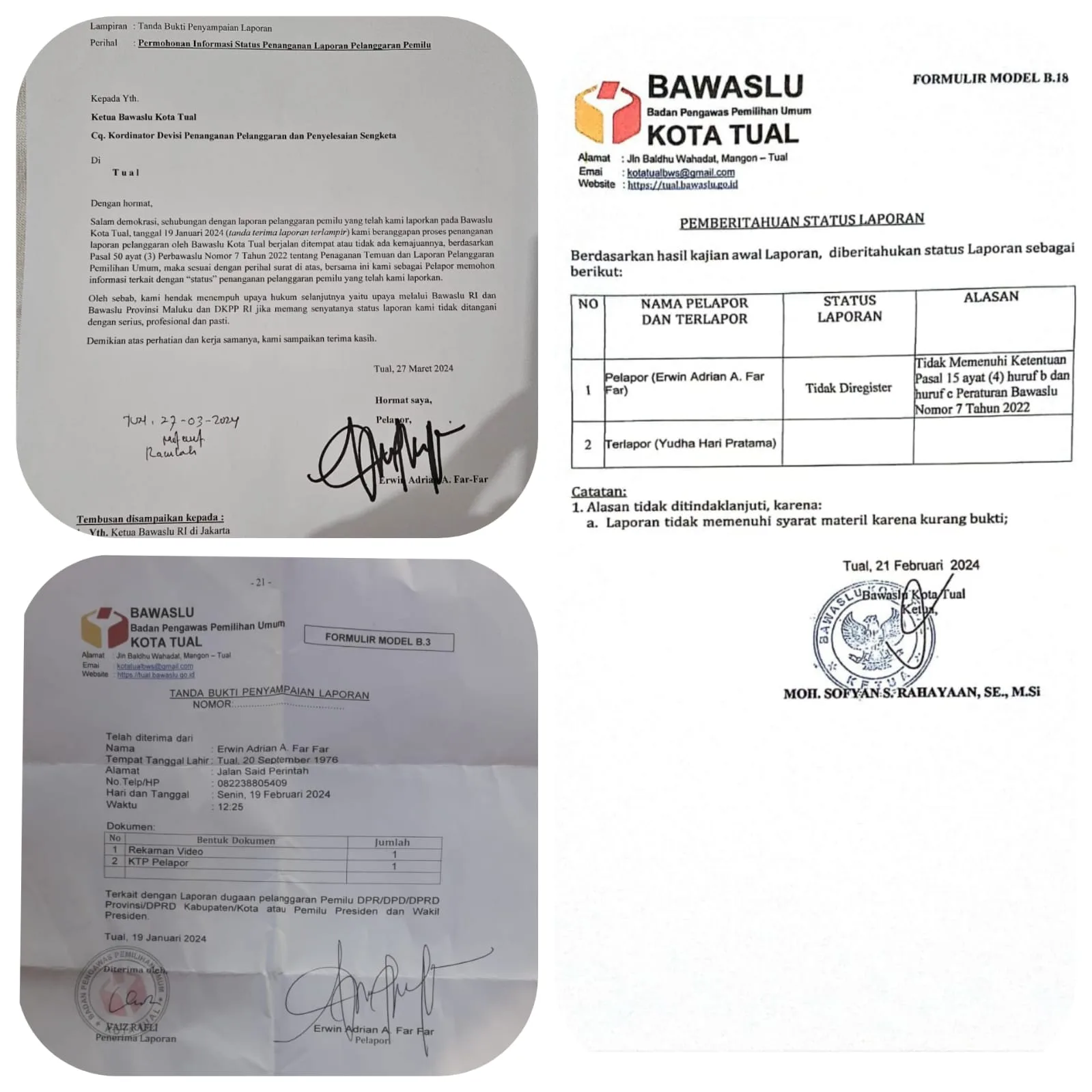 Far-Far menceritakan “uniknya selama dalam kurun waktu dari tanggal 16 Februari s/d tanggal 27 Maret2 024, beta seng pernah diberitahukan terkait dengan perkembangan laporan, apakah laporan yang beta sampaikan itu kurang-kurang apa bagitu, eh tahunya setelah beta terima pemberitahuan status laporan, Bawaslu Kota Tual bilang beta pung laporan tidak memenuhi syarat materil karena kurang bukti, ini kan cara-cara kerja zeng batul model bagini” kesalnya.