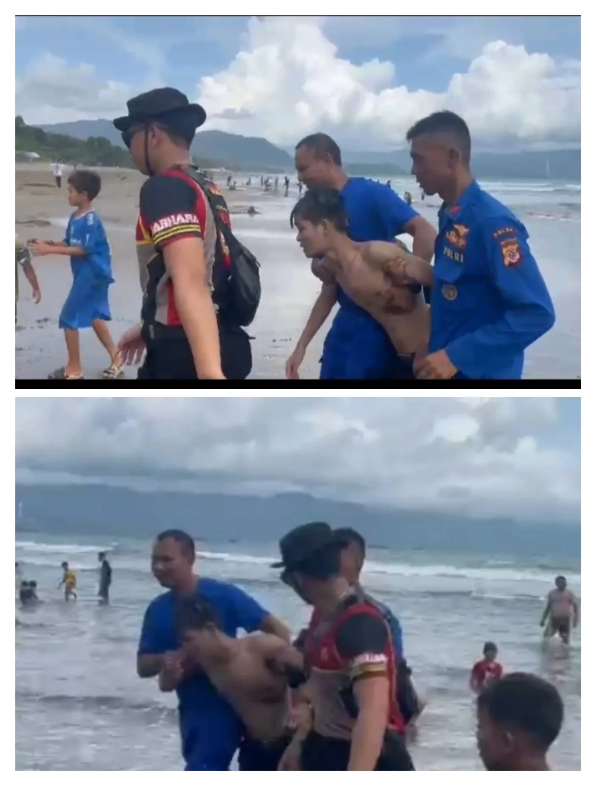 Sukabumi – Salah seorang wisatawan yang nyaris tenggelam lantaran terbawa arus ombak pantai selatan, berhasil diselamatkan Polairud bersama Balawisata pantai palabuhanratu, (11/04/2024).