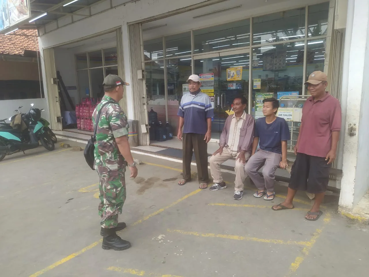 BEKASI PEBAYURAN – Memasuki masa Libur Lebaran Babinsa Koramil 11 Pebayuran Kodim 0509 Kabupaten Bekasi, Sertu Munawar masih tetap setia dan siaga menyambangi Masyarakat Di Ruko Indomaret Kampung Telukhaur RT 03 RW 02 Desa Karang Haur Kecamatan Pebayuran Kabupaten Bekasi, Minggu 14/4/2024.
