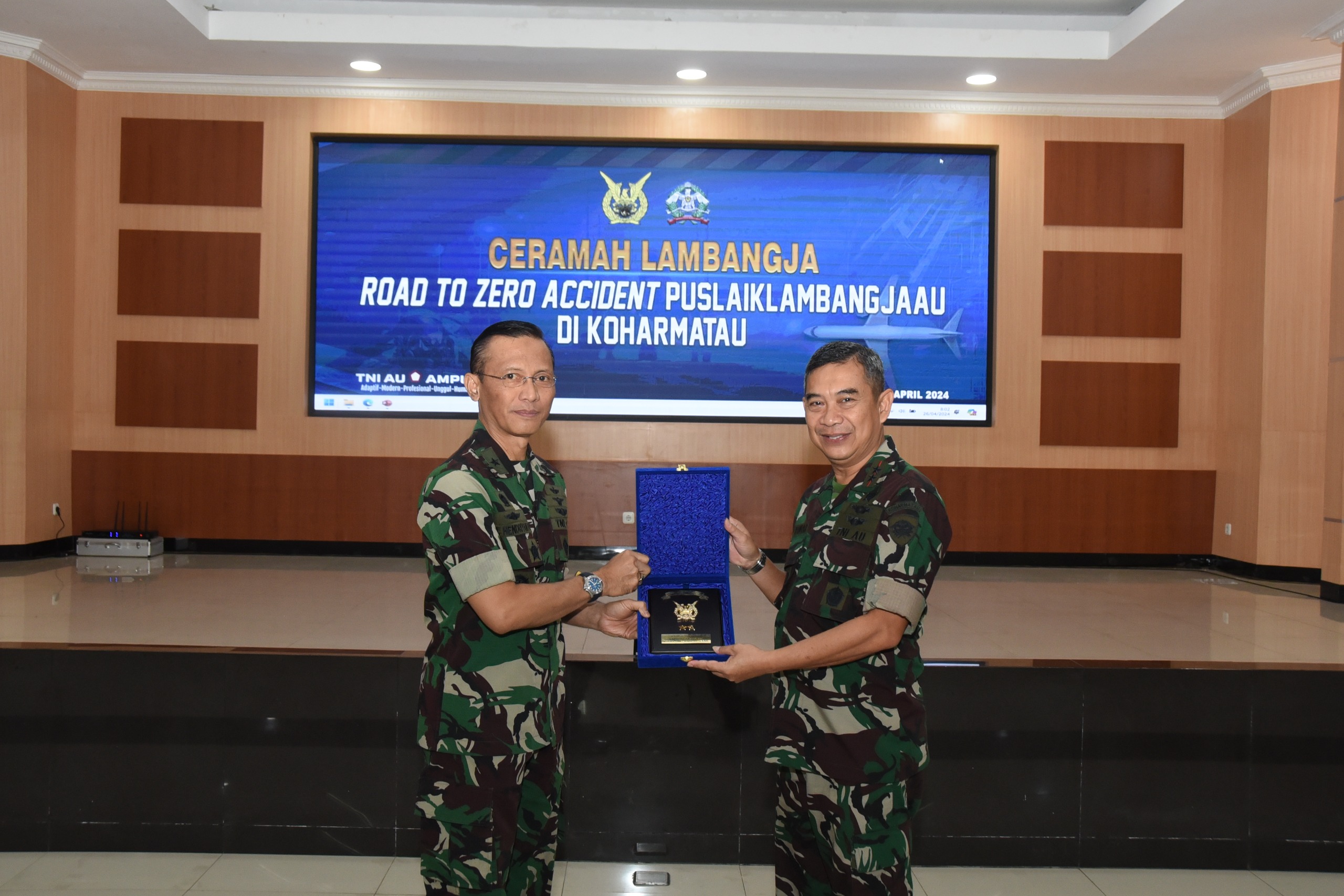 Marsma TNI Tjatur Pudji Handojo, S.E, para pejabat Koharmatau, Komandan Depohar 10, Panitia Kegiatan Ceramah Lambangja _Road To Zero Accident_ Puslaiklambangjaau, Perwakilan Personel Koharmatau, Perwakilan Personel Lanud Husein S, Perwakilan Personel Dislitbangau.