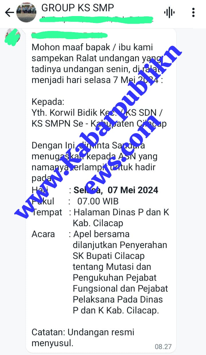 Lebih anehnya lagi, setelah beredarnya informasi tersebut bahwa adanya Penyerahan SK PJ Bupati Cilacap tentang Mutasi dan Pengukuhan Pejabat Fungsional dan Pejabat Pelaksana Pada Dinas P dan K Kab. Cilacap pada tanggal 07 Mei 2024, jam 08:27 muncul kembali undangan dan sekaligus Meralat Undangan yang tanggal 06 Mei 2024 yang isinya masih sama di mana pada Hari Selasa besok akan di adakan Penyerahan SK PJ Bupati Cilacap tentang Mutasi dan Pengukuhan Pejabat Fungsional dan Pejabat Pelaksana Pada Dinas P dan K Kab. Cilacap. yang dilaksanakan di halaman kantor Dinas P dan K Kab. Cilacap. Berikut isi WhatsApp yang di sebarkan di Group KS SMP se Kab. Cilacap.