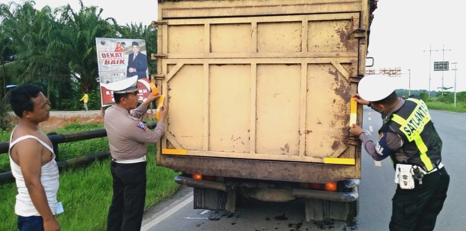 SIAK – Satuan Lalu Lintas Polres Siak melaksanakan kegiatan pemasangan sticker/tanda berwarna Scotlight di body truck angkutan barang di Jalan Lintas Perawang – Buton tepatnya di KM 69 Kecamatan Dayun, Selasa (07/05/24).