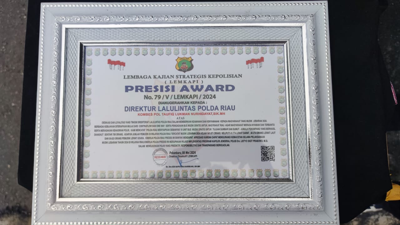 PEKANBARU – Direktur Lalu Lintas Polda Riau, Kombes Pol Taufiq Lukman Nurhidayat SIK MH raih piagam penghargaan presisi award dari Lembaga Kajian Strategis Kepolisian Indonesia (Lemkapi).