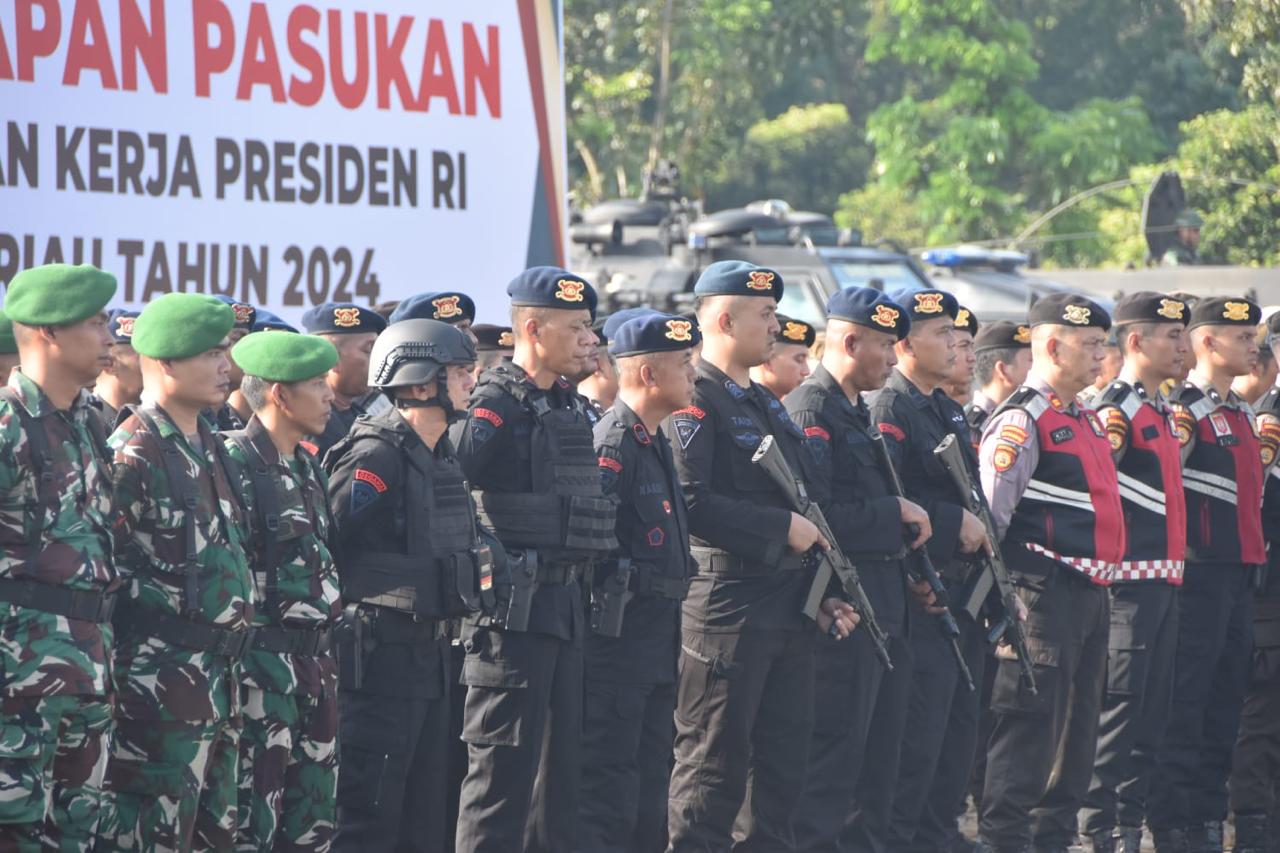 Pada kesempatan tersebut Dansat Brimob Polda Riau Kombes Pol Dwi Yanto Nugroho SIK M Han mengatakan, dalam kunjungan Presiden RI ke Provinsi Riau, pihak Polda Riau bersama jajaran dan juga unsur TNI serta Formopimda telah melakukan apel gelar pasukan untuk mendukung kelancaran kegiatan kunjungan Presiden RI.