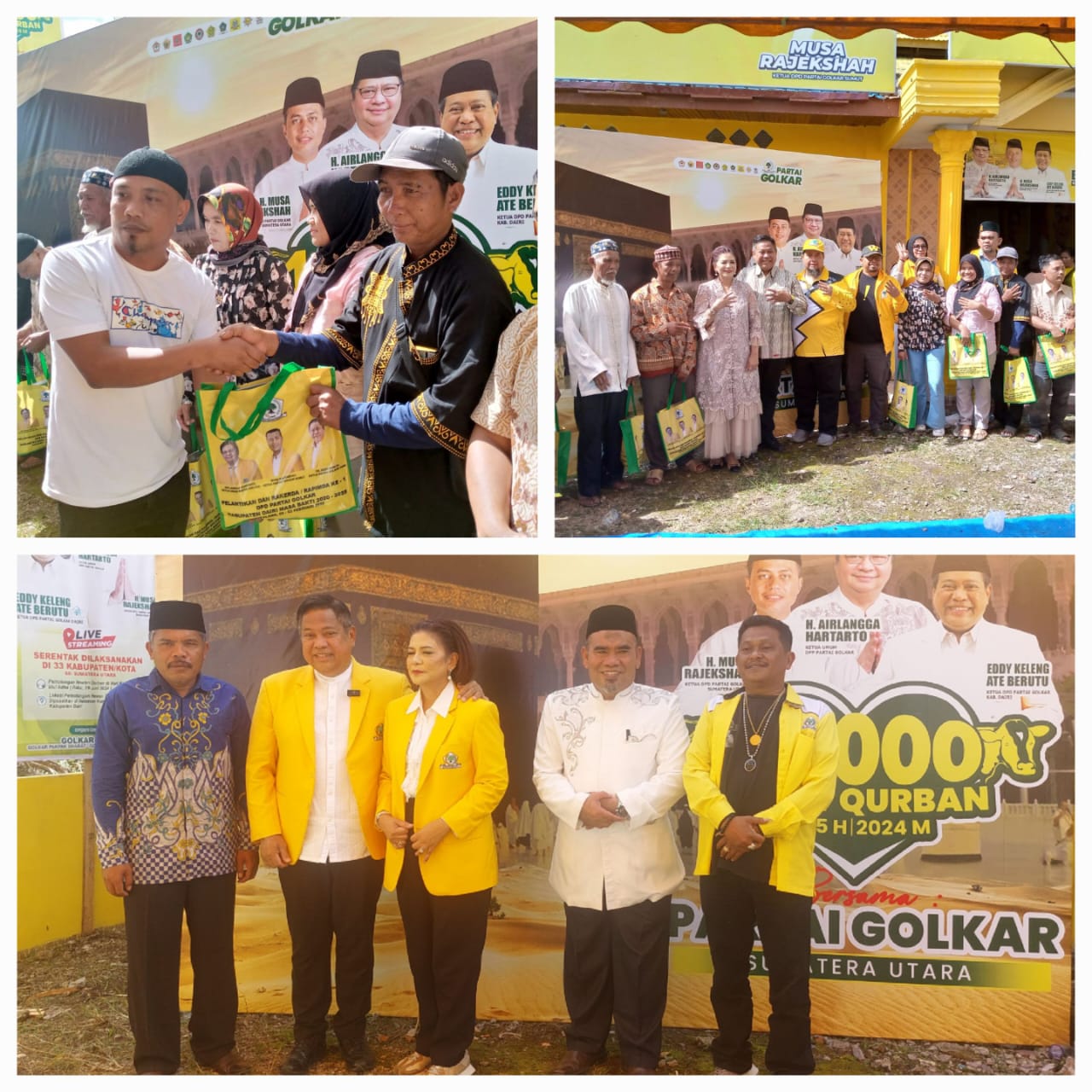 Pada kesempatan ini, Golkar menyalurkan qurban berupa dua ekor sapi dan dua ekor kambing, dengan 300 kupon disediakan bagi masyarakat penerima. Ketua DPD Golkar, Eddy Kelleng Ate Berutu, dalam sambutannya menyampaikan bahwa kegiatan ini adalah wujud nyata kepedulian Partai Golkar terhadap kesejahteraan masyarakat.